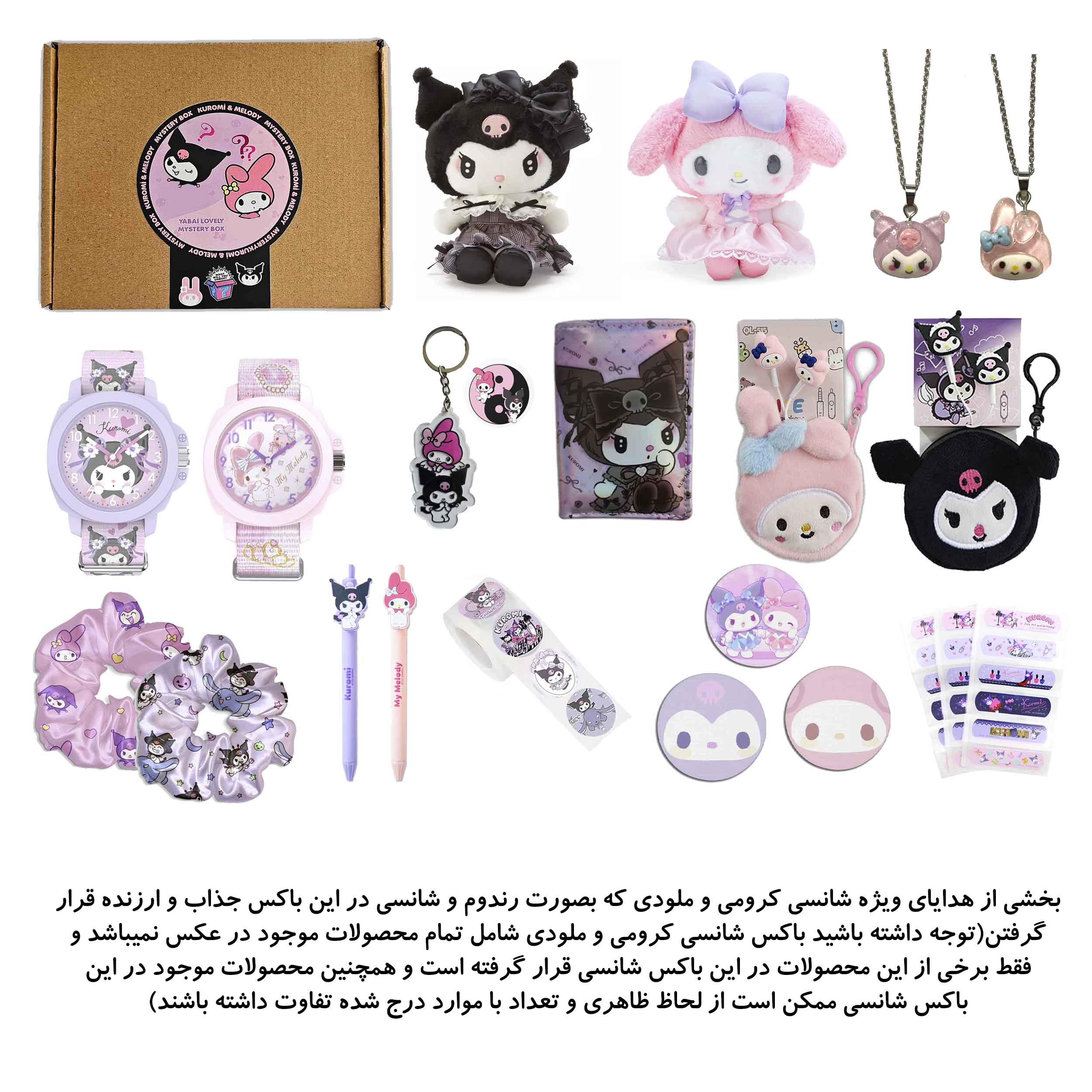 جعبه شانسی کرومی و ملودی محصولی دخترانه و پر از هدیه های مهیج این شانسی دارای 7 الی 10 محصول همانند کیف پول و عروسک و زیورآالات و نوشت افزار و اکسسوری و استند و جاکلیدی و هندزفری و غیره میباشد که همگی از طرح های محبوب کرومی و ملودی جمع آوری شده اند و در این جعبه قرار گرفته اند که به خوش شانس بودن شما بستگی دارد تا هدیه های بهتری از کرومی و ملودی در این جعبه شگفت انگیز کشف کنید این جعبه محصولی مناسب برای هدیه به دوستان و عزیزان شما میباشد